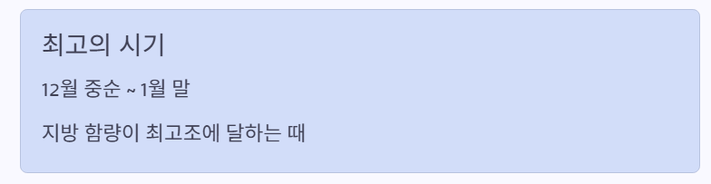 특히 가장 맛이 절정에 이르는 시기는 12월 중순부터 1월 말까지로, 이때는 살이 단단하고 지방 함량이 최고조에 달합니다.