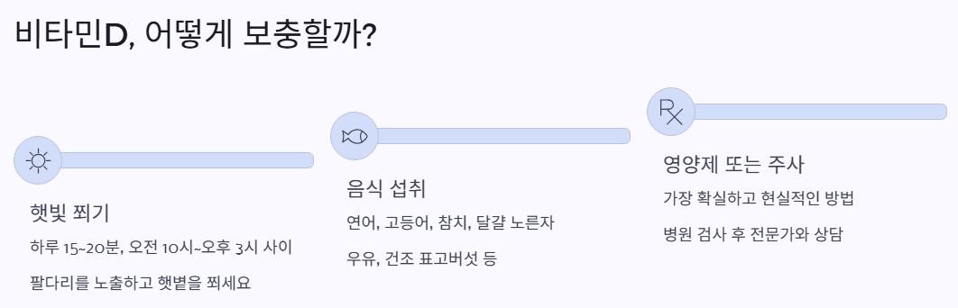 가장 현실적이고 확실한 방법입니다. 특히 실내 생활이 길고, 이미 결핍 증상이 나타났다면 보충제 섭취가 필수적입니다. 병원에서 간단한 혈액 검사로 본인의 비타민D 수치를 확인하고, 의사나 약사와 상담하여 적정 용량의 영양제(또는 3~6개월 주기의 주사)를 선택하는 것이 좋습니다.