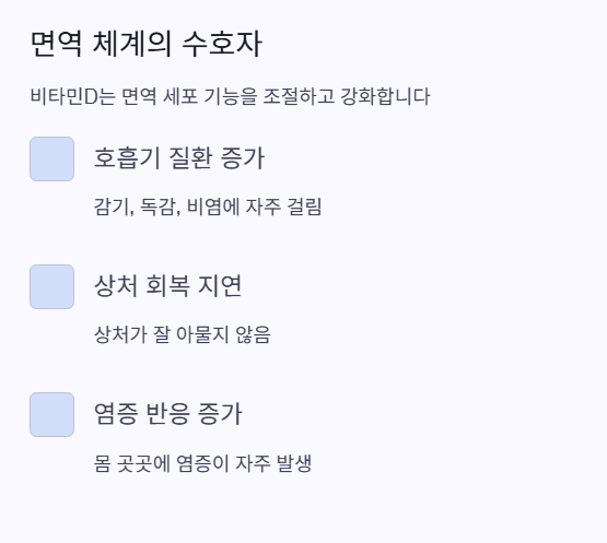 체내 비타민D 수치가 낮으면 면역 세포의 기능이 떨어져 감기, 독감, 비염 등 호흡기 질환에 더 쉽게 노출됩니다. 또한, 상처가 잘 아물지 않거나 염증이 자주 생기는 것 역시 관련 신호일 수 있습니다.