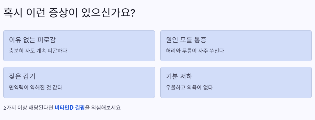 아래 4가지 증상 중 2가지 이상 해당된다면, 비타민D 결핍을 심각하게 의심해보고 관리를 시작해야 합니다.