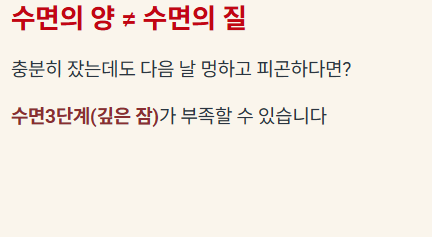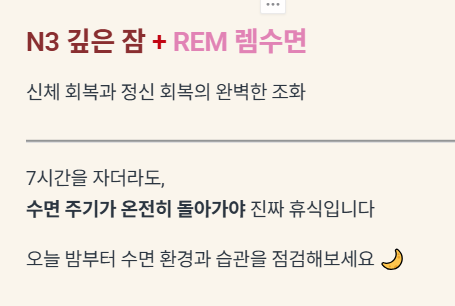 따라서 7시간을 자더라도, 초반에 자주 깨면 '깊은 잠(N3)'이 부족해 신체 회복이 더디고, 후반에 자주 깨면 '렘수면'이 부족해 정신이 멍하고 피곤할 수 있습니다.