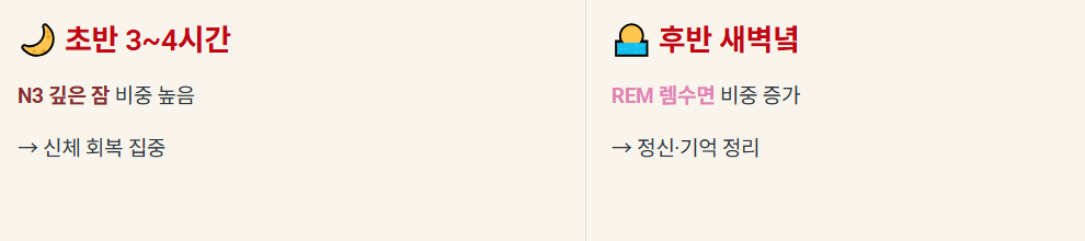 여기서 중요한 점이 있습니다. 수면 주기는 밤새 동일하게 반복되지 않습니다. 잠의 전반부(초반 3~4시간)에는 '깊은 잠(N3)'의 비중이 높고, 잠의 후반부(새벽녘)로 갈수록 '렘수면(REM)'의 비중이 길어집니다.