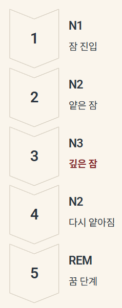 [N1(진입) → N2(얕은 잠) → N3(깊은 잠) → N2 → REM(꿈)]