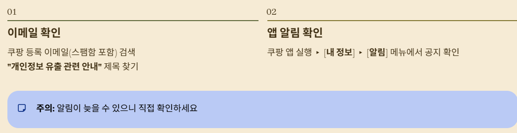 쿠팡에 등록된 이메일함(스팸메일함 포함)에서 [개인정보 유출 관련 안내]라는 제목의 메일이 왔는지 검색해 보세요. 또한 쿠팡 앱 내 [내 정보] - [알림] 메뉴에서도 관련 공지를 확인할 수 있습니다.