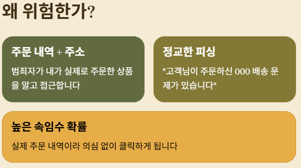 이번 사태가 심각한 이유는 해커가 "고객님, 000(실제 주문상품) 배송 주소가 잘못되어 반송됩니다"라는 식의 아주 정교한 문자를 보낼 수 있기 때문입니다. 내가 진짜 시킨 물건이므로 의심 없이 링크를 누를 확률이 매우 높습니다.