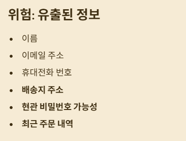 - 유출된 정보: 이름, 이메일, 휴대전화 번호, 배송지 주소(현관 비번 포함 가능성), 최근 주문 내역