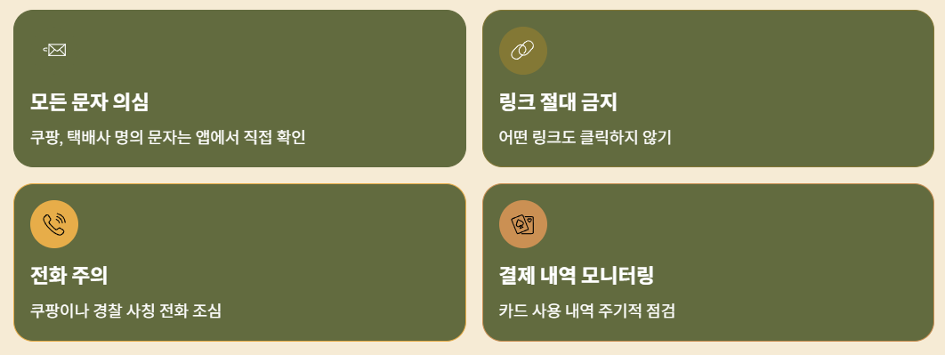 - 혹시 문자를 받았다면: 링크를 누르지 말고, 반드시 쿠팡 공식 앱을 켜서 배송 상태를 직접 확인하세요.
