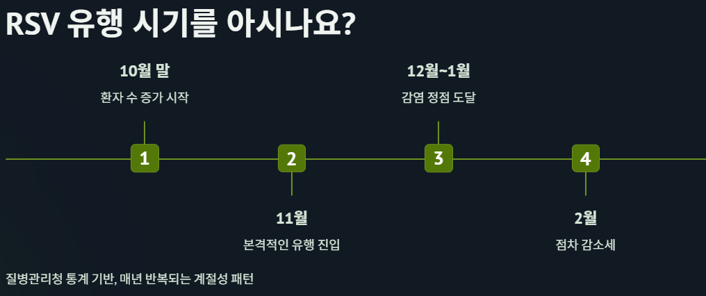 질병관리청 감염병 포털의 호흡기 바이러스 감염증 통계에 따르면, RSV 감염증은 전통적으로 매년 10월 말부터 증가하기 시작해 12월~1월 사이에 정점을 찍는 경향을 보입니다.